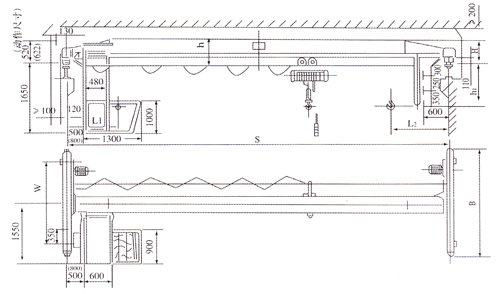 注:(1)跨度 (S)每0.5米一档,并增加19.5米,22.5米两种规格,用户可自选 (2)起重机总重包括电动葫芦自重。 (3)操纵形式分:地面与操纵室操纵。